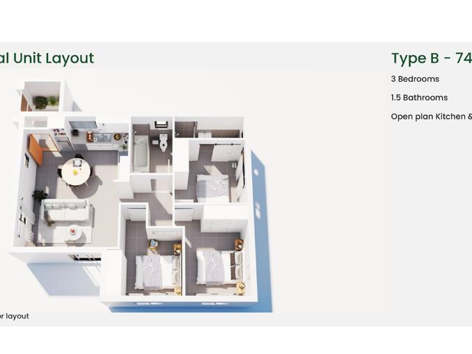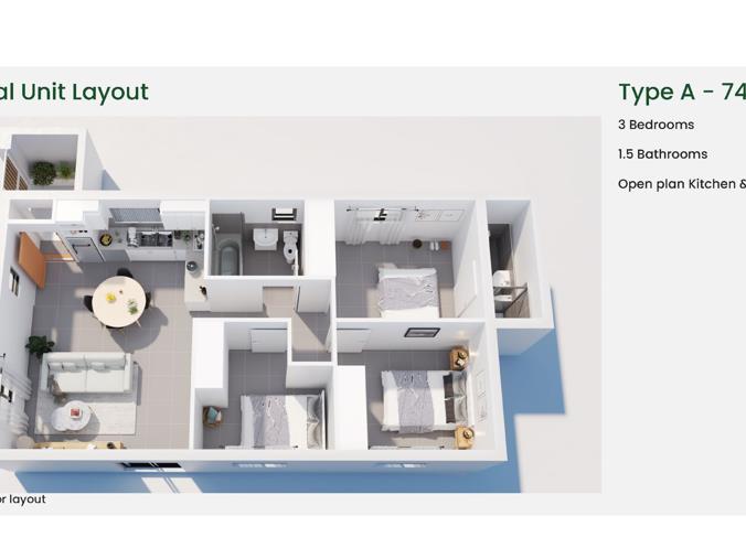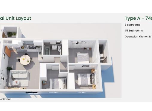 Choose from 81 standalone homes, each featuring 3 bedrooms and open-plan living spaces, available in two designs: Type A and Type B.
