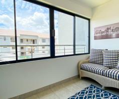 Modern and stylish U shaped kitchen with under counter oven, white engineered stone countertops and Novalam kitchen cupboards leading into an open plan living room with a sliding door to a private balcony.